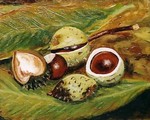 1993kastanjes op kastanjebladeren.
