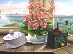 1990stilleven van botervloot,kamerplant en koffiemolen.